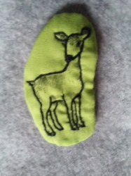 JUGEMテーマ:子供の遊び・創造性 各色「 布用インク 」をそろえて、きれいにケースに並べています。 ハンコに合わせて、色をそろえるためにも。 どの種類でも、シルエットがはっきりするのは「 黒 」でしたが。 そのラインの上から、刺繍して、線を濃く仕上げました。 小鹿くんのつもりです。 キュートさが伝わるといいのですが・・・
