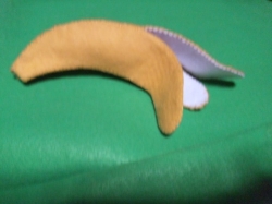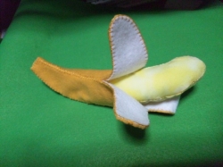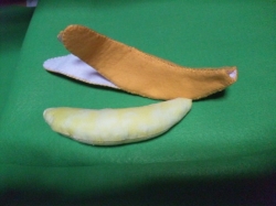 JUGEMテーマ:子供の遊び・創造性 ウォッシャブルフェルトで 「 ままごと 」を作っています。 作り貯めては、幼児・保育関係に「 プレゼント 」するために。 子供達の好きな「 バナナ 」を、作ってみました。 でも、皮が・・・ せっかくの「 3枚合わせぬい 」のせいで「 角ぼっく 」て。 う〜ん、もっと上手にできるはず・・・だったのに。 残念。 もっと、考えねば。 「 型紙の改良 」に、とりかかることにしました。