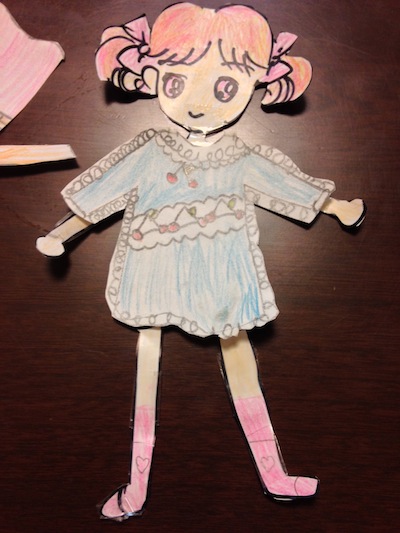 保育園で着せ替えの洋服を描いたそうです。 (子どもの絵はさすがに保育園の先生が描いてくれています。すごく上手^^) のんは洋服の絵をデザインしたそうです。 あえてサクランボを斜めに配置する構図にしているそうです。 なかなか良いデザインです。(親バカ) 他にもこんなデザインを考えたそうです。 左上のワンピースは襟の部分が多色使いになっています。 基本的に同系色でまとめつつも、右側のワンピースはポイントで青を使ったりしていて、配色がうまいなーと思いました。 (バカ親ですいません・・・。ま、...