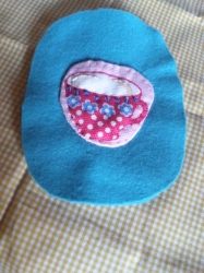 JUGEMテーマ:子供の遊び・創造性 「 紫色 」のカードが不評だったので、外して「 フチ=枠 」を変えました。 新しい色は、「 ブルー系 」です。 アップリケも、かえて、刺繍も始めました。 「 カップケーキ 」の、絵合わせですから・・・ アップリケは「 ミルクティー 」が、たっぷりの【 ティーカップ 】です。 1、カップの、ラインにそって「 ステッチ 」を入れる。 2、ティーの薄茶色を、アウトラインする。 3、口元の、ブール―のもようには、フレンチナッツを。 4、白い水玉...