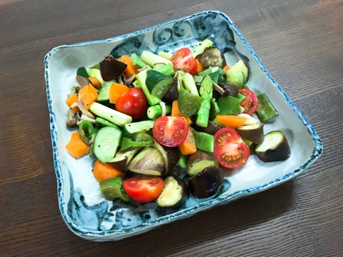 JUGEMテーマ:ふるさと納税 [A-2] 松山長なす 愛媛県 松山市(9) 遠軽産アスパラ(約2.4kg) 北海道 紋別郡 遠軽町(5) 松山長なす(1:配達時)、遠軽産アスパラ(1:配達時) 温野菜です。温野菜のつもりです。ある野菜を使って僕が作りました。たくさんある野菜を使いたかったということもありますが、少々作り過ぎました。 長茄子、アスパラガス、キュウリ、人参、シメジ、ささぎ、万願寺唐辛子、最後にミニトマトです。 ゴチャゴチャし過ぎです。作り過ぎで盛り付...