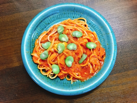 JUGEMテーマ:ふるさと納税 F-13 そらまめ 2kg 鹿児島県 阿久根市(3) B12.黄玉ねぎ【20kg入り】 北海道 富良野市(24) そらまめのトマトスパゲッティです。 玉ねぎの入りトマトソースにそらまめが「後のせ」されただけのシンプルなスパゲッティです。 トッピングのそらまめが目立ちすぎです。茹でたそらまめが残っていたから仕方ないのですけれど、こんな盛付をしていると妻に怒られます。 そらまめがソースに絡まって少し違和感を感じなくな...