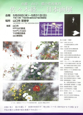 いよいよ始まります。 山口市では久しぶりの大きな展覧会です。 「菜香亭」では2007年以来、2度目の展示となります。 これまで描き溜めた六曲屏風や四曲屏風など近年の代表作、 新作、萩焼作品等々、100点以上の佐々木経二の世界を一堂にご覧いただけます。 併せて、会期中は連日 運筆の実演を行っております。 その場で色紙にご希望の花の絵をお描きします。 (展覧会開催記念として特別価格にてお分けする予定です) 初夏の山口へ、どうぞお出かけください。 ーーー 〜 京 都・山 口 ...