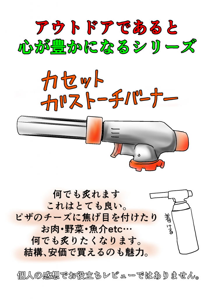 JUGEMテーマ:アウトドア アウトドアで無くても支障はないけどあると嬉しい。 <カセットガストーチバーナー> 何でも炙れる。 ぶっちゃけ炭の焦げ目より美味い。(うまく感じる。) スーパーで売ってるあのガス缶に付けるだけ。 案外、安価で買える。(楽天とか) サブカルアウトドアより 玄人アウトドアのイメージ(あくまで個人のイメージ) ガストーチバーナー プリンも炙れる ガストーチバ...