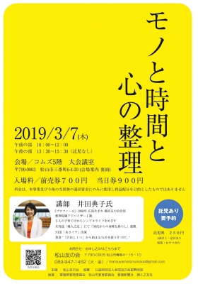 JUGEMテーマ:お知らせ JUGEMテーマ:働く母・ワーキングマザー JUGEMテーマ:講習会 JUGEMテーマ:衣食住 ***** 松山友の会からの報告です ***** 3月7日(木) NHKあさイチでも「スーパー主婦」として有名になられた 井田典子さんの講習会が開催されます 松山では初めての講習会です 井田さんの普段の生活は 忙しい主婦にもぜったい役に立ちます! ぜひ聞いて下さい! ネット申し込みはこちらをクリックしてください 又は、松...