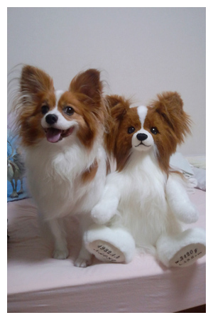 6月27日に無事挙式&披露宴をすまされた、千葉県の T 様より可愛いお写真が2枚届きました! 愛犬とぬいぐるみのツーショット写真です。 愛犬パピヨンとレトリバー似のウエイトドールです。 パピヨンは豪華な耳の毛と額の模様を似せて 体の模様は3か所 レトリバー似のわんちゃんのぬいぐるみ 鼻と目のふちをピンクに レトリバー系の骨格を似せて T様より 『この度はホントにホントにステキなウエイトドックをありがとうございました 両家とも愛犬にそっくりで両親は大喜びでした! (...