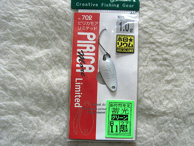 JUGEMテーマ:管理釣り場 管理釣り場 おすすめルアー ヤリエ ピリモアリミテッド No.702 1.0g グリーン蓄光&ホロリウム MKフック2#8装着 長時間蓄光タイプで裏面は黒+ホロリウム 蓄光効果とフラッシング効果で相乗効果が期待できます スプーンの動きはウォブリングアクションも強くアピール型です スレきったトラウトちゃんにおすすめです