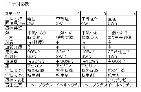 JUGEMテーマ:3Dprinter 去年8月にコロナ対応表をまとめてみてUPしていたのですが、最近、寄生虫薬イベルメクチンが注目されて きましたので、改めて、表を改定してみました。 去年の8月当時から、スーパーコンピュータでの、分子解析で、寄生虫薬が、コロナ治療に効く可能性が 指摘されていました。その効用が明確でないため、正式使用の承認はされていませんが、患者からの 希望があれば、イベルメクチンの処方が保険対応で使用可能になっています。 レセプトの摘要...