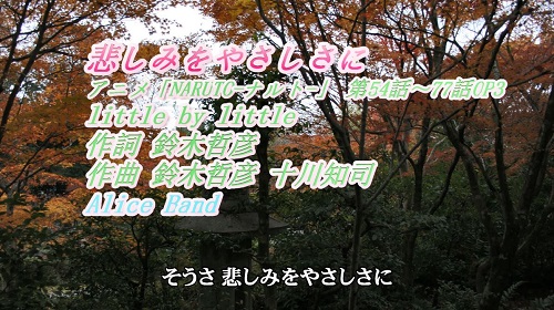 JUGEMテーマ:3Dprinter アニメ「NARUTO-ナルト-」 第54話〜77話OP3から 「悲しみをやさしさに」 をアリスバンド、東方チーム、ピアノ伴奏、ショートバージョンで歌ってみました。 日本語の字幕あり。伴奏は、シンセサイザー調にしています。 オリジナルは、little by little が歌っています。 作詞 鈴木哲彦、作曲 鈴木哲彦 十川知司。 この動画は、ニコニコ動画でのみ公開です。 ユーチューブに登録しようとすると、著作権メッセージが出ます。 一部...