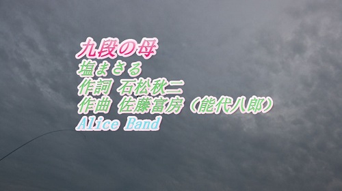 JUGEMテーマ:3Dprinter 懐かしの名歌から 「九段の母」 をアリスバンド、おにいさんチーム、ピアノ伴奏、FULLバージョンで歌ってみました。 日本語の字幕あり。伴奏は、ギター調にしています。 オリジナルは、塩まさる が歌っています。 作詞 石松秋二、作曲 佐藤富房(能代八郎)。 この曲は、昭和14年1939年に発表されました。 作曲の佐藤富房は、ペンネームで、本名の能代八郎の作曲となっている場合もあります。 ではまたーー。(^^)/~~~