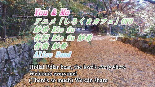 JUGEMテーマ:3Dprinter アニメ「しろくまカフェ」OP3から 「You & Me」 をアリスバンド、東方チーム、ピアノ伴奏、ショートバージョンで歌ってみました。 日本語の字幕あり。伴奏は、ギター調にしています。 オリジナルは、紗希 Rie fu が歌っています。作詞 Rie fu 紗希、作曲 紗希。 おひとり様で歌えるようにしています。 ではまたーー。(^^)/~~~
