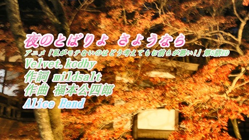 JUGEMテーマ:3Dprinter アニメ「私がモテないのはどう考えてもお前らが悪い!」第5話EDから 「夜のとばりよ さようなら」 をアリスバンド、おにいさんチーム、ピアノ伴奏、ショートバージョンで歌ってみました。 日本語の字幕あり。伴奏は、ギター調にしています。オリジナルは、Velvet.kodhy が歌っています。 作詞 mildsalt、作曲 福本公四郎。 ではまたーー。(^^)/~~~
