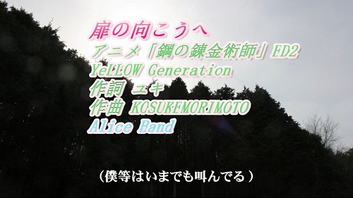 JUGEMテーマ:3Dprinter アニメ「鋼の錬金術師」ED2から 「扉の向こうへ」 をアリスバンド、おねえさんチーム、ピアノ伴奏、ショートバージョンで歌ってみました。 日本語の字幕を付けています。伴奏は、ギター調にしています。 オリジナルは、YeLLOW Generation が歌っています。作詞 ユキ、作曲 KOSUKEMORIMOTO。 この動画は、限定公開モードです。このブログのリンクでのみ再生可能です。 ユーチューブに登録しようとすると、著作権メッセージが出ますので...