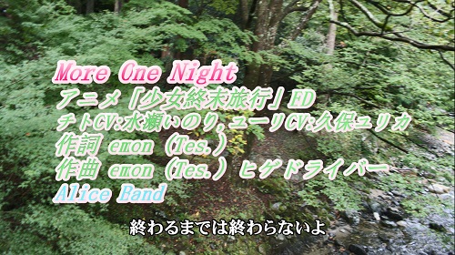 JUGEMテーマ:3Dprinter アニメ「少女終末旅行」EDから 「More One Night」 をアリスバンド東方チーム、ピアノ伴奏、ショートバージョンで歌ってみました。 日本語の字幕あり。伴奏は、ファンタジー調にしています。 オリジナルは、アニメ声優 チトCV:水瀬いのり,ユーリCV:久保ユリカ が歌っています。 ではまたーー。(^^)/~~~