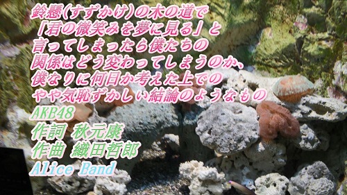 JUGEMテーマ:3Dprinter J-POP「AKB48」から 「鈴懸(すずかけ)の木の道で 」 をアリスバンド 東方チーム、ピアノ伴奏、FULLバージョンで歌ってみました。正式な歌の名称は、70文字を超える、「鈴懸(すずかけ)の木の道で「君の微笑みを夢に見る」と言ってしまったら僕たちの関係はどう変わってしまうのか、僕なりに何日か考えた上でのやや気恥ずかしい結論のようなもの 」です。 日本語の字幕あり。伴奏は、ライブ調にしています。 オリジナルは、AKB48が歌っています。作詞...