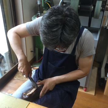 JUGEMテーマ:靴教室今日は朝から雨で少し肌寒いです。これぐらいが丁度いい。釣り込み中のSさん。初めての靴作りで、今日は午前・午後と2レッスン続けて受けています。はじめスウェットのパーカーを着てましたが脱いでます。力いっぱい釣り込むと暑くなるのです。合間合間に「痛ーっ、痛ーっ!!」と聞こえてきますが、釘を打つ時にちょいちょい指も当ててしまってる様子。でも初めてにしてはなかなか器用で、バランス良く釣り込めてますよ。帰ったらビールを飲みたいので今日は瀬田まで歩いて帰るそうです(ダイエット中)。Sさんが釣...