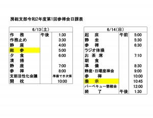 JUGEMテーマ:禅 人間禅会員各位 新型コロナウイルス感染も終息に向かいつつあり、各地で参禅会等の開催が企画されています。 先頃房総支部令和2年度第一回参禅会の日程を変更の上案内させていただきました。 その後、本年度よりご担当の葆光庵名誉総裁老師から参禅の機会を増やすご指示を頂き、日課を変更させていただきました。 変更後の日課表と参加票を添付いたします。 6月13日(土)は午後4時から静座開始になります。 午後5時から参禅ですが、これ...