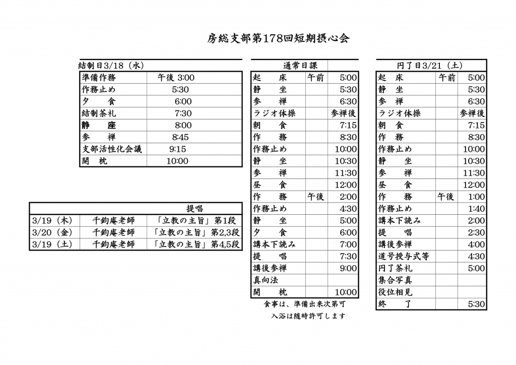 JUGEMテーマ:禅 人間禅会員・名誉会員各位 房総支部第178回摂心会は短期摂心会として日程を変更しての開催予定となりました。 摂心会日課表と参加票をお送りいたします。 3月18日(水)の19:30からの結制になります。 その後の日程は通常の摂心会とほとんど同じです。 21日の夕方に円了後は懇親会無しでそのまま解散になります。 短期摂心会になりましたが、千鈞庵老師に房総支部をご担当頂ける最後の摂心会です。 できるだけ多くの皆様のご参加をよろしくお願い申し上げます。 摂心会参加票...