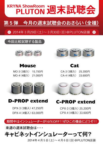 JUGEMテーマ:オーディオついに、インシュレーターシリーズの週末試聴会も今週でラストになりました!明後日3月29日開始のインシュレーター試聴会の第5弾は、『今月の週末試聴会のおさらい(全種)』という事で、KRYNAの全インシュレーターを対象に、使い方やその効果を試聴していきます。シングルスパイク&Joint-PROP構造のCat&Mouse、振動する製品に使えるダブルスパイクのD-PROP、振動しない製品に効果的な樹脂製のC-PROPなど、様々なモデルがあるKRYNAのインシュレーターシリーズを、ぜひこの機会にショールームでご試聴下さい!...