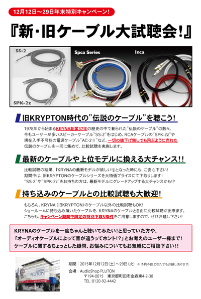 JUGEMテーマ:オーディオ12月の特別試聴会/キャンペーンのお知らせです!今回の試聴会では、「新・旧ケーブル大試聴会!」をテーマに、スピーカーケーブルSpcaシリーズ / RCAケーブルIncaシリーズ / 電源ケーブルAcca5など、KRYNAのケーブル製品を試聴していきます!特選アウトレットコーナー等で販売している旧KRYPTON時代のケーブル(SS-2やSPK-2z)との新・旧比較試聴も出来ますので、アウトレット品をお使いの方もぜひお越し下さい!!今回は、12月12日(土)から29日(火)まで、年内いっぱいのキャンペーンです。最新のKRYNAケ...