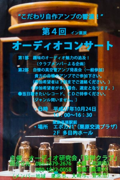 JUGEMテーマ:オーディオ Jazz & audio ワールド・ソサイティ主催 皆さんこんにちはーワールドソサイティ仙台事務局です。 めっきりと秋らしい季節に変わりましたがお変わりございませんか? さて、秋はオーディオの季節ですね。 今回、ワールドソサイティがいつもお世話になっております、オーディオ研究会「音楽クラブ」様より オーディオ・コンサートのお知らせを頂きましたので、お知らせ致します。 第4回目 ”こだわりの自作アンプの響演” 第一部 趣味のオーディオ魅力の追求! 第二部 自...