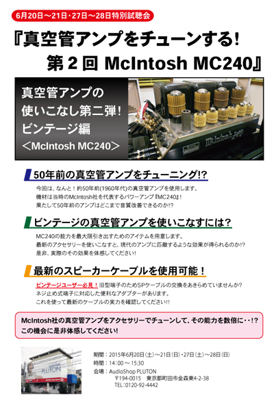 JUGEMテーマ:オーディオ6月の特別試聴会のお知らせです!今月のテーマは、前回大好評だった「真空管アンプをチューンする!」の第二回「ビンテージアンプ編 McIntoshのMC240」になります。MC240といえばMcIntoshを代表する名機の一つですが、1960年代に発売され約50年が経ちます。果たしてこのビンテージアンプにKRYNAアクセサリーを使用することで、明確な音質向上効果はあるのでしょうか?今でも使ってる人が沢山いらっしゃる人気のモデルですが、当時はアクセサリーを使って音質を向上させようなんて認識のなかった時代です。ビ...