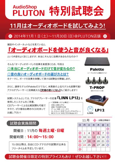 JUGEMテーマ:オーディオ 11月は、オーディオボードを試してみよう!!11月の試聴会は、「本当にオーディオボードだけで音が良くなるの?」をテーマに、KRYNAのインシュレーションボード(オーディオボード)『Palette』の試聴会を実施します!アンプやスピーカー、もしくはケーブル類などと違って、オーディオボードは音楽情報の"通り道の外側"にあたるセッティング系のアクセサリーのため、効果がイメージしにくいと思っている方も多いかと思います。その驚くべき効果を、PLUTON店頭の試聴スペースにて実際に体験して頂けるの...