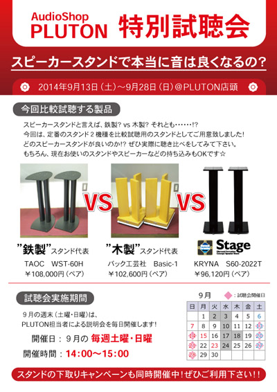 JUGEMテーマ:オーディオおはようございます!今日20日(土)と21日(日)の2日間は、スピーカースタンド比較試聴会の第2弾!PLUTON担当者による説明会イベントは14時開始です。なかなか純粋に比較試聴できる機会が無いスピーカースタンドですが、今回は木製スタンド、鉄製スタンド、そしてダイアモンド・フォーメーション採用の"Stage"と、3モデルを一度に比較出来る大チャンスですので、ぜひ一度お越し下さい!説明会終了後は、各スタンドを自由に試聴出来る☆フリータイム☆もありますので、現在お使いのスタンドやスピーカーをお...