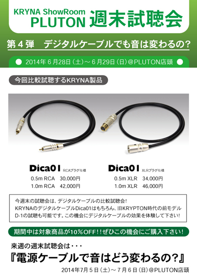 JUGEMテーマ:オーディオ明日からは、いよいよデジタルケーブルの比較試聴会が開催されます!D/Aコンバーターをお使いの皆様、デジタルケーブルにはどんなケーブルをお使いですか?「0と1のデジタル信号なのだから、ケーブルで音が変わるはずはない!」などと言われる事も多いデジタルケーブルですが、実際に聴き比べをしてみると・・・・・・今回は、KRYNAのDica01はもちろん、旧KRYPTON時代のD-1(前モデル)との比較試聴も可能です。初めていらっしゃる方も大歓迎!ぜひ今週末はAudioShopPLUTONにお越し下さい♪期間中、PLUTON店頭...