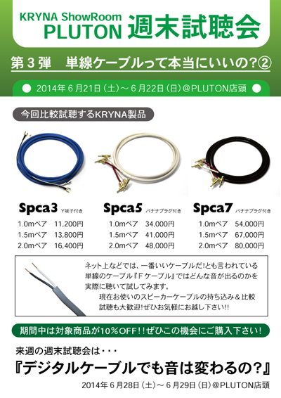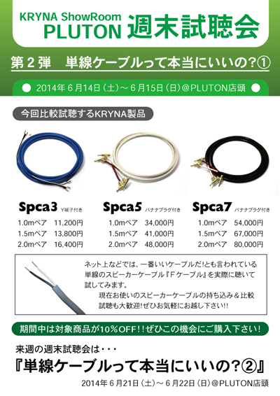 JUGEMテーマ:オーディオ明日からの土・日は、先週に引き続き「単線ケーブル比較試聴会」の2回目ケーブルシリーズ試聴会の第2弾!今週も、『Fケーブル』(屋内配線用の電源ケーブル)をリファレンスに、"超極細より線"V.S."単線ケーブル"の比較試聴を実施します!KRYNAの【ホログラフィックサウンド】システムで単線ケーブルを使うとどんな音になるのか!?この機会に、ぜひ体験してみて下さい♪期間中、PLUTON店頭ではスピーカーケーブルシリーズを10%OFFでご購入可能ですので、ぜひこの機会ご検討下さい♪『単線スピーカーケーブ...