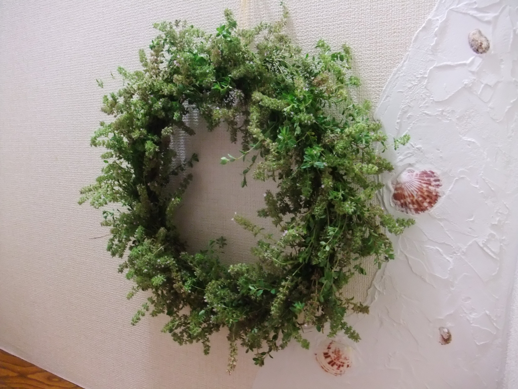 JUGEMテーマ:ハーブ 暑い夏の間じゅう、グランドカバーとして地面を覆ってくれているクリーピングタイム。 もう、花が終わって、種を作ろうとしている。 ちょっと伸びすぎているところもあるので、ざっくりと剪定をした。 花は終わっているけれど、それなりにキレイなので、数日しか瑞々しさが持たないことを 承知で、シンプルなリースを作ってみた。 玄関に飾ると、タイムの爽やかな香り。 自分で塗った、...