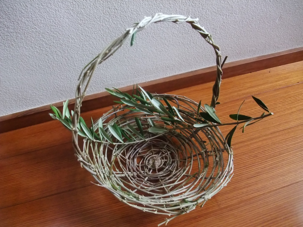 JUGEMテーマ:ハーブ オリーブのネタが続きます。 今日も、雨が降ったり止んだりの中、オリーブの剪定、第2段です。 葉っぱをとった後の小枝が、しなやかなので、今日はカゴを編んでみました。 いや、カゴというよりは、ザルに取っ手をつけたもの、っていう感じか。 乾いたときにどうなるかは、まだ分からないので、ちょっと様子見です。
