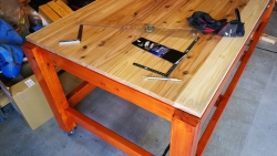 作業台迷走中。 気付きますか? そうです。寸法間違えました。 2×4 1本分両サイドで大きく作ってしまいました。 もう今更、補正する気にもなれないのでごまかします。 幸い2×4材分なので こんな感じで両サイドに枠を作ります。 上手くごまかせたと思います。 いい感じです。 さて、これで一応、あらかた完...