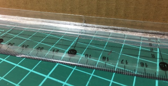 「【自作】保護付きカッターガイド」で作った 300mmの透明カッターガイド、 ガードレール部分に切れ目が入ってしまったので修繕しました。 <修繕前> ガードレール部分に切れ目が入ってしまっているのが 分かりますでしょうか。 使用中にカッターの刃が乗り上げて切り込んでしまったのです。 勿論、このお陰で指先には刃が当たらずに済みました...