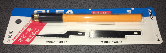 先月、「オルファ」というメーカーの「ホビーのこ」を購入しました。 これが、期待通りに使い勝手が良くて重宝してます。 【オルファ OLFA】OLFA ホビーのこ 167B 価格:579円(税込、送料別) (2017/12/16時点) 大きさは、肢の部分がボールペンくらいの大きさで、 カッターの刃のような大きさの、鋸刃なんですね。 刃の部分の長さは、46mm程度。 その外側に肢に固定するための部分があります。 刃の身の厚みは0.3mm程度ですが、 ...