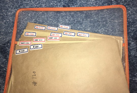 『研磨紙』、サンドペーパーとか紙ヤスリとかとも呼びますね。 皆さんはどのように仕舞ってますか? 私はまだ数が少ないうちは、 ちょうどA4サイズが入りそうな箱にまとめて入れてしまっていました。 年月が流れ、 何種類かのものと、切った切れ端と、ごちゃごちゃに混ぜて仕舞っていると いざ使う時にちょっと面倒なんですよね。 欲しい番手を探すのが。 しかも、先に手が伸びるのが小さいものより上にあるものだから、 大きな新しいものをついつい下ろしてしまいがち。 気付けば、中途半...