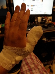 やっちまったさね。 今日も休みのライフワーク。 残りの仕上げにいそしんだ訳ですが。 慣れって怖いね。 いつも通りサクサクと木を切っていたらね 板が丸ノコの勢いに押し出されたのよ。 うん。 もう解るね。 添えていた押さえていた手が、そのまま ちょっとスプラッターになるからこの辺で 左手の親指そぎおとしてしまった。 幸い。切断じゃなく そぎおとし。 溢れ出る血 うきゃー大騒ぎ。 止まらない。 ...