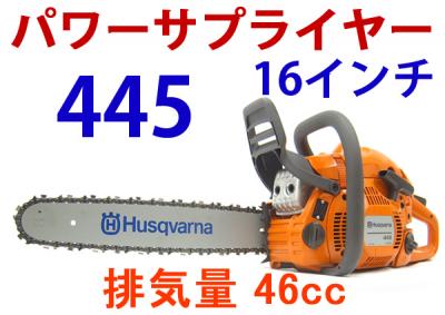 JUGEMテーマ:DIY&工具 ・ご購入日:5/3 ・ご注文商品:即納 ハスクバーナ チェンソー 445 16インチ バー 【9669553-36】 ・商品URL:http://www.powersupplier.co.jp/?pid=58199013 <1>なぜハスクバーナを選びましたか? ⇒それぞれが堅牢なパーツで、且つ、壊れにくい構造に仕上げていると思う。更にパワー。 (親子で営林していた当時、親父が好んでいた)某国産品も最近まで使っていたが、 高回転で軽量だがブレーキ系・ハンドル・防振ゴム・etc・...