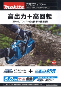 JUGEMテーマ:DIY&工具 マキタより、30ccのエンジン相当パワーの、充電式チェンソーが発売されました。バーの長さも350mmです。 30cc相当の力があれば、かなりの用途が広がるかと思います。 またバッテリー式なのでメンテが簡単なのが良いですね。