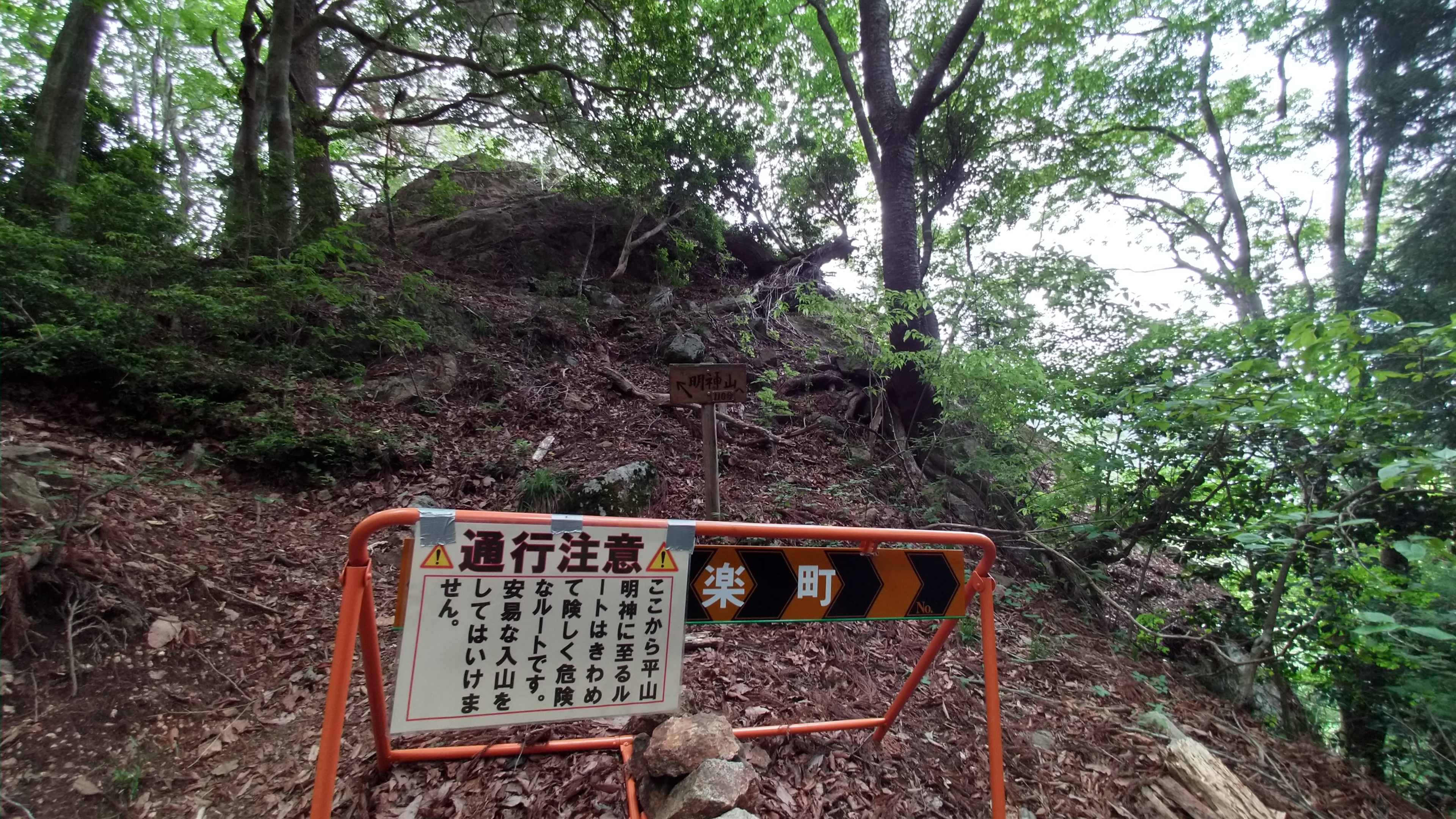 岩古谷山から平山明神山に至る登山道は、この四山縦走一番の正念場。ここから先は、痩せ尾根、鎖場の岩稜登り、急下降、鬱蒼とする樹林帯など、緊張感の続く縦走路になる。 岩古谷山から先は行ってはイケないとばかりに、工事の通行止め標識が登山道を塞ぎ通せん坊するが(;´・ω・)、そんなことをされれば余計ワクワク・ドキドキ感で行きたくなる衝動に駆られて、簡単に標識の横をスルーし前進! まだ遠くに見える平山明神山を見渡し、痩せ尾根を慎重に進む &nbs...