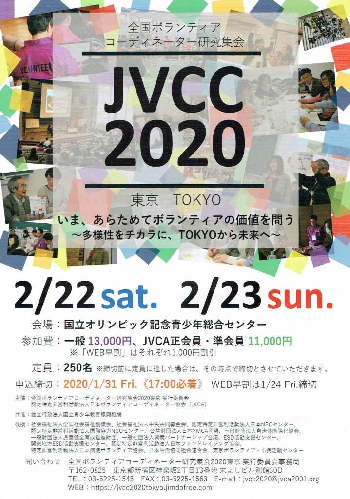 JUGEMテーマ:イベント情報 JUGEMテーマ:ボランティア 全国ボランティアコーディネーター研究集会2020東京 参加者募集中! 日 程:2020年2月22日(土)・2月23日(日)の2日間 会 場:国立オリンピック記念青少年総合センター(東京都:小田急線「参宮橋」下車10分) テーマ:いま、あらためてボランティアの価値を問う ―多様性をチカラに、TOKYOから未来へー 参加費:一般=13,000 円、JVCA正会員・準会員=11,000 円 (WEB早割は各々1,000 円割引)※別途交流会参...