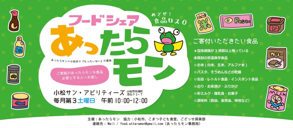 JUGEMテーマ:ボランティア ご家庭であまった保存食品をあつめています。 毎月第3土曜日 10:00-12:00まで、 小松市サンアビリティーズ(符津町念仏2-7) お持ちください。 ▶︎あつまった食品は必要な方々へおとどけします。 ******************************************* あったらモン=小松弁で『もったいない』の意味 こまつモンらで、フードロスゼロをめざし活動。 ・ご家庭の保存食品をあつめて必要な方々へお届け ・あまった食品を持ち寄ったイベント企画...