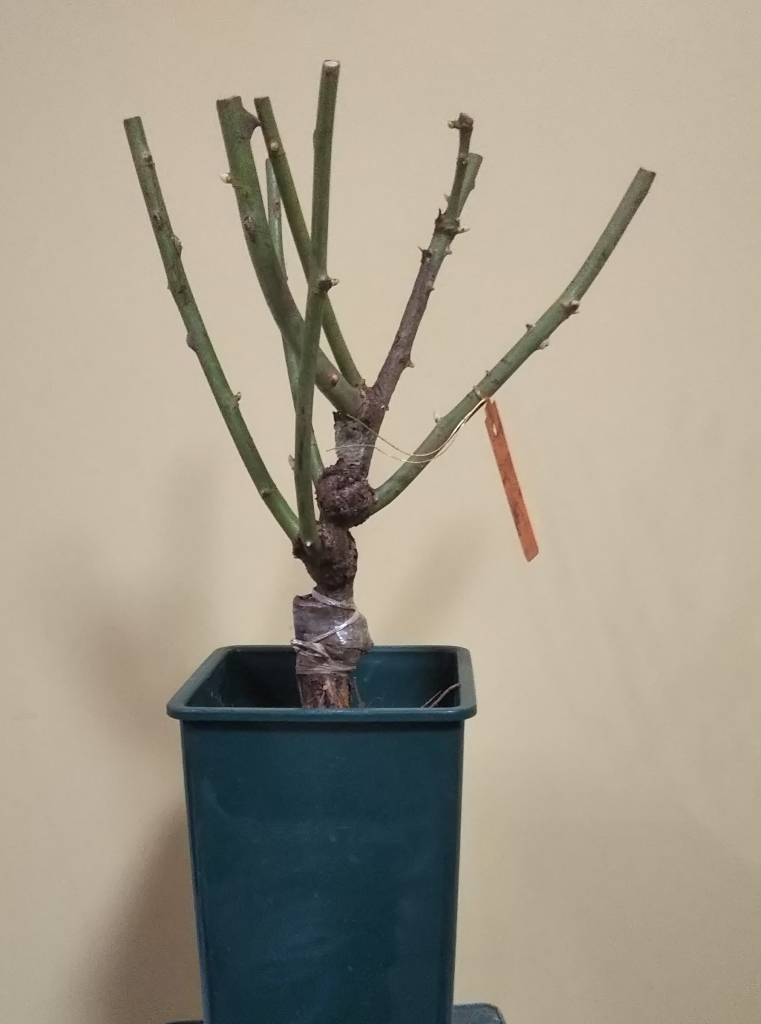 昨日ホームセンターから、予約していたミニ薔薇のファーストインプレッションの大苗が届いたと連絡があったので今日受け取りに行ってきた。 ミニ薔薇としては花も大きく、株も大型の品種だそうですが、ハイブリッドティーローズなどに比べると細めの枝。 いちばん太い枝の切り口部分の直径で7mm位です。(その枝の付け根付近は10mm位) いちばん細い枝だと5mm位。 軽く剪定して芽かきをし...