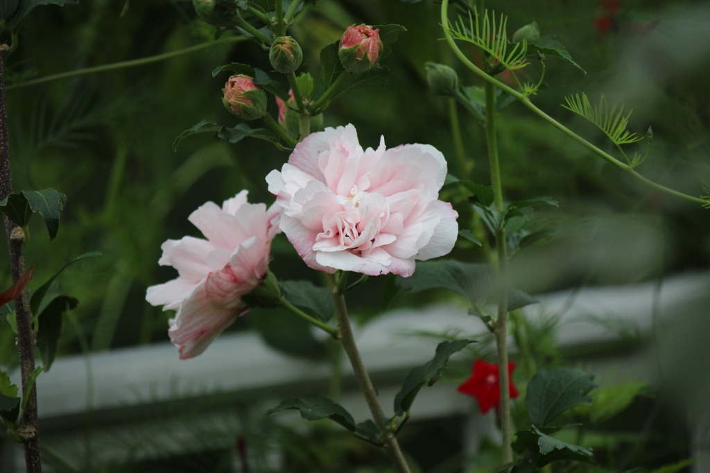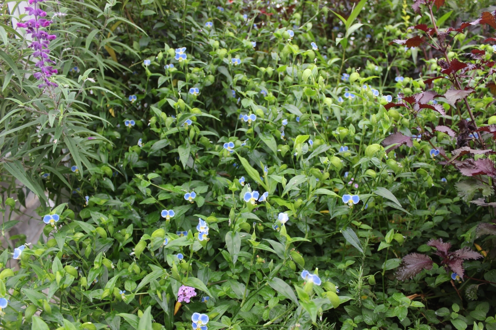 ムクゲとルコウソウ アメジストセージ メガネツユクサがたくさん咲いてきた メガネツユクサ、這い性ローズマリー、コバノランタナ、烏葉ミセバヤなど 烏葉ミセバヤ ホザキナナ...