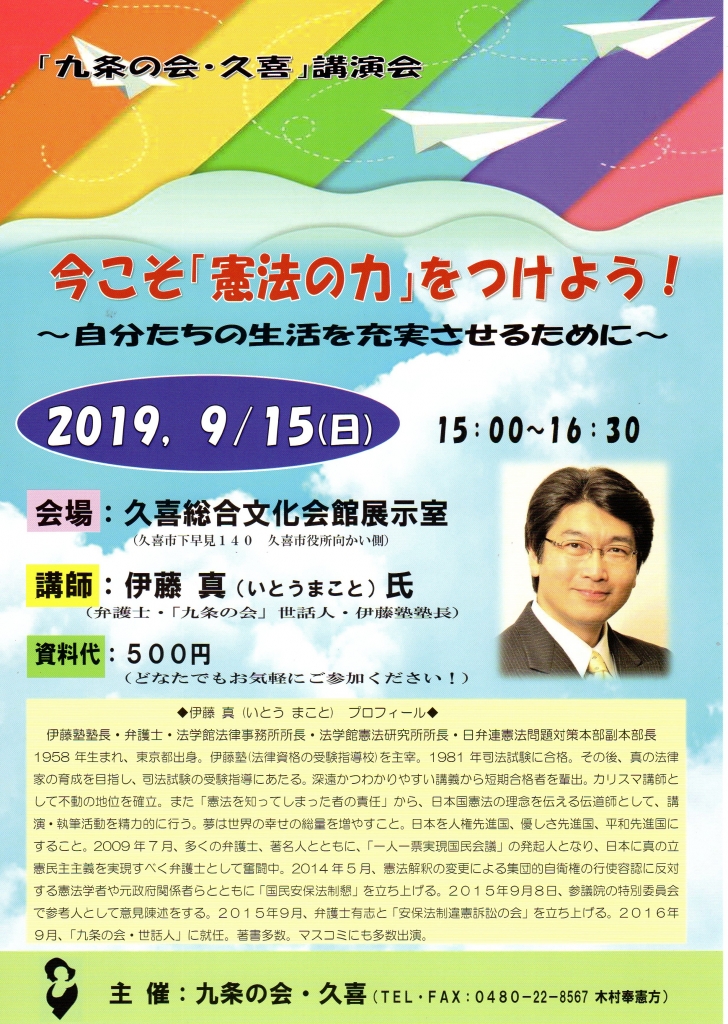 「九条の会・久喜」公開講演会 今こそ「憲法の力」をつけよう! 〜自分たちの生活を充実させるために〜 9月15日(日)15:00〜16:30 会場:久喜総合文化会館展示室... 講師:伊藤 真氏(弁護士・「九条の会」世話人) 資料代:500円 (どなたでもお気軽にご参加ください!) JUGEMテーマ:趣味・日常生活