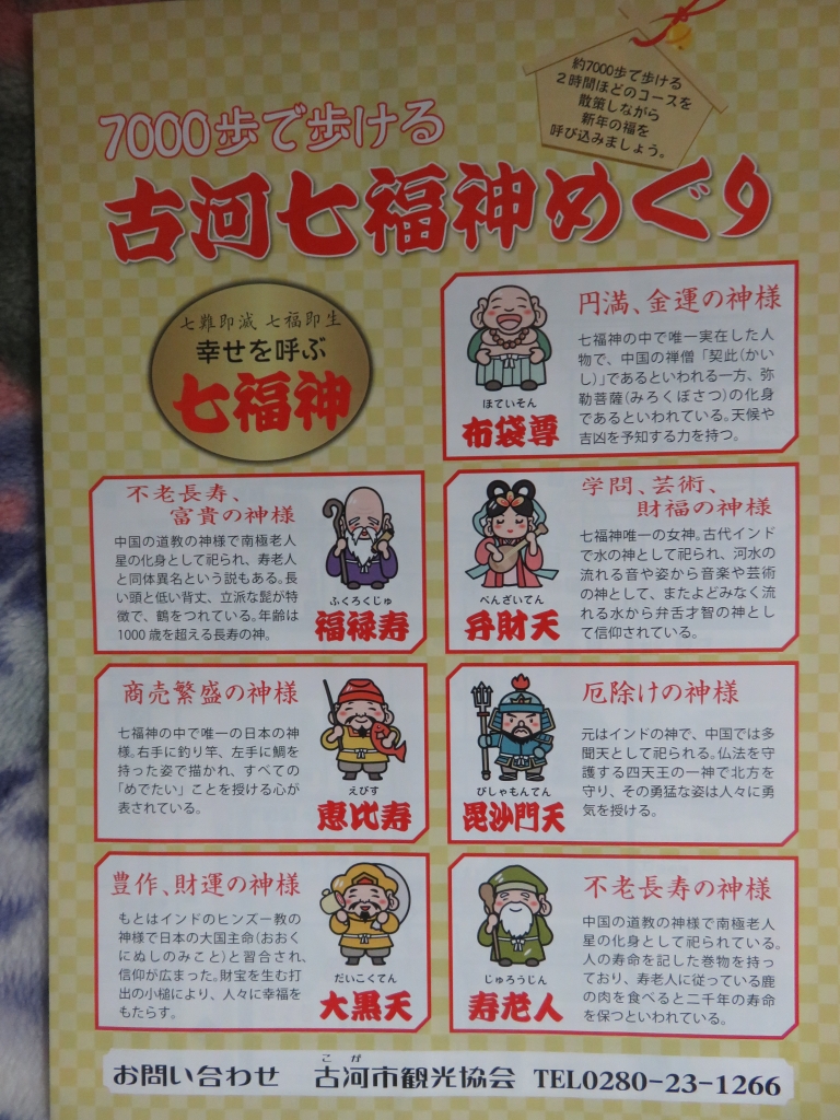 今日は、妻と二人「古河七福神めぐり」に参加しました。 朝から大勢の参加者で、長いところでは1時間も並んでお詣りしてきました。おかげで古河の裏通りを少し詳しくなりました。父がお世話になったせんべい屋さんに久しぶりにお会いしたり、レトロな喫茶店も発見しました。約4時間かけて10ヵ所を回り終え、終着点の駅ビルでおまけに釣られて3冊購入。お年玉を貰った子どもみたいですね。 JUGEMテーマ:趣味・日常生活