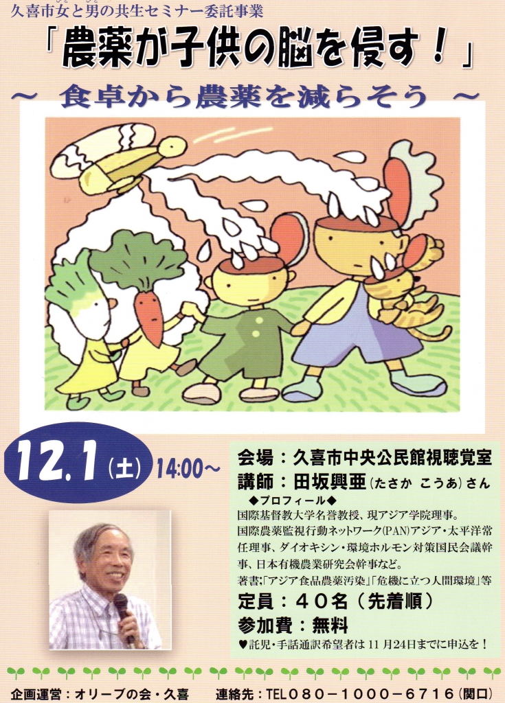 今日は、久喜市女と男の共生セミナー「農薬が子どもの脳を侵す!」〜食卓から農薬を減らそう〜に参加しました。 講師は、田坂興亜先生(日本消費者連盟運営委員、アジア学院理事、元国際基督教大学(ICU)教授)。 パワーポインを使って、 1、フィリピンのミンダナオ島を訪問し、日本に輸入されたバナナに残留していた農薬。農家の空中散布と子どもたちへの影響。 2、子どもの脳に悪影響を与える新しい農薬「ネオニコチノイド」。ネオニコチノイド系農薬使用の問題点。文部省が発表した日本における子どもの異常に激増...