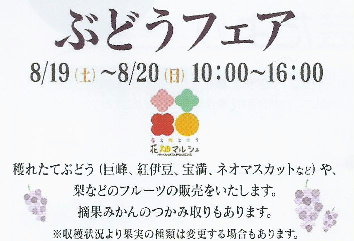 JUGEMテーマ:趣味・日常生活 暑い! 家に居ても暑いので、ぶどうフェアへ。 普段、果物を買うことがめったにないのですが、収穫したての果物を販売されるので、ぶどうを一房仏前のお供えに購入してきました。 摘果みかんは固くて酸っぱそうだと思っていましたが、購入したお客さんがその場で1個食べてみて、「濃くて甘い!」と感動しておられました。 キウイフルーツは秋に向けて成長中! パイナップルは数が少ないので、たぶん店...