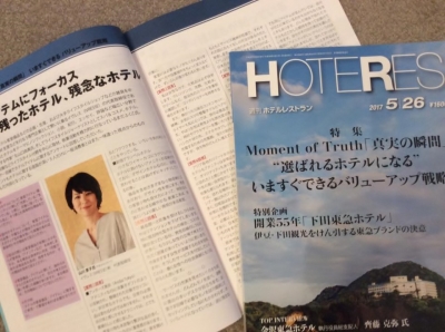 JUGEMテーマ:本の紹介 「週刊ホテルレストラン 5月26日号」 ホテルが大好きな利用者としての目線で、 インタビュー記事を書かせて頂きました。 経営者目線とか、女性経営者論、、ときどきクリエーターとして。。。... そんな原稿依頼が多い中、今回はホテル利用者目線! とっても 楽しく取り組み出来ました。 オファーに感謝。 過去サイコーに嬉しい ご依頼! ありがとうございました!!