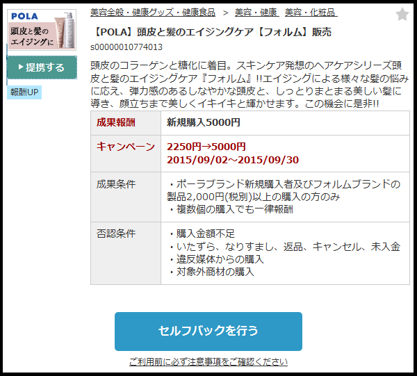 JUGEMテーマ:☆☆自宅でお小遣い稼ぎ☆☆ A8.netのセルフバック でいい案件を見つけてしまいました!すでにA8.net をご利用の方はご存知かもしれませんがこちらの案件です「POLA」の案件になります!条件を拡大します成果条件と否認条件を合わせて考えますと●ポーラで初めて購入する方がフォルムブランド2000円(税別)以上を購入した場合成果が発生する、という事だと思います。日本語って難しわ( ̄▽ ̄;)と言う事でフォルムランドで2000円(税抜)に一番近い商品を探したところ・・・シャンプーもコンディショナーもLサイズ(...
